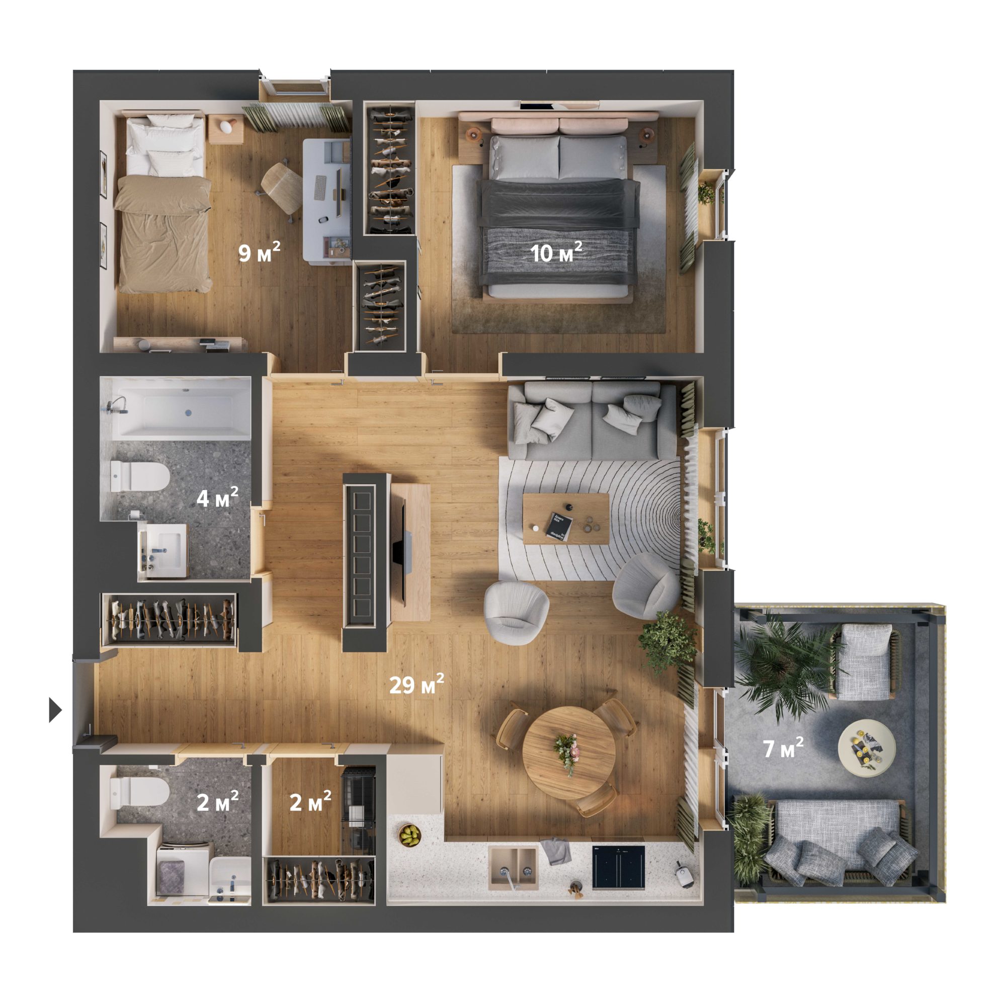 Две увеличенные спальни. Две ванные комнаты. Гардеробная. Место для встроенных шкафов. Максимальная приватность
